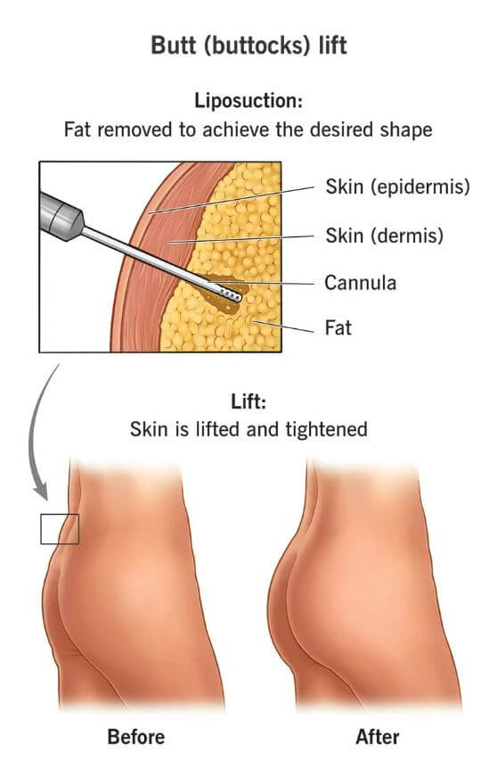 In order to achieve a smoother and more pleasing contour, excess sagging skin and fat are removed or restore the tissue to enhance the gluteal volume. but may improve a dimpled, irregular skin surface. This procedure may be included in lower body lift or may be performed separately.