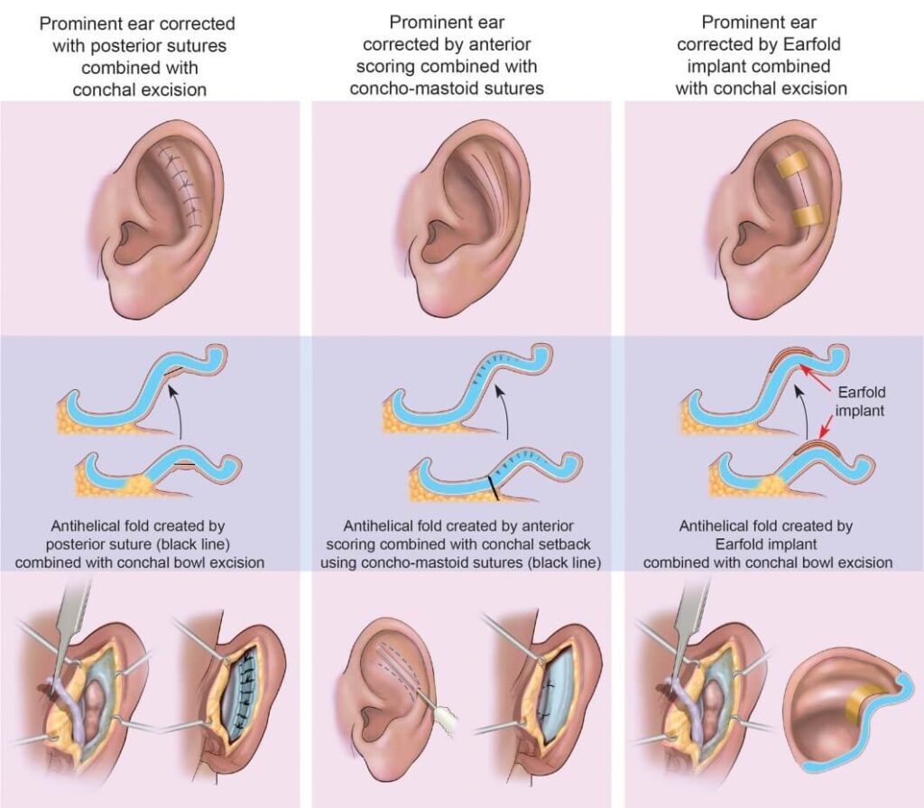 Correction of protruding ears uses surgical techniques to create or increase the antihelical fold (just inside the rim of the ear) and to reduce enlarged conchal cartilage (the largest and deepest concavity of the external ear). Incisions for otoplasty are generally made on the back surface of the ear. When incisions are necessary on the front of the ear, they are made within its folds to hide them. Internal, no removable sutures are used to create and secure the newly shaped cartilage in place, and reduction the earlobe volume by external incision