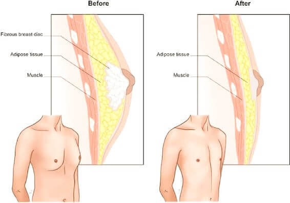 In severe cases of Gynecomastia , the weight of excess breast tissue may cause the breasts to sag and stretch the areola (the dark skin surrounding the nipple). In these cases the position and size of the areola can be surgically improved and excess skin may be reduced
