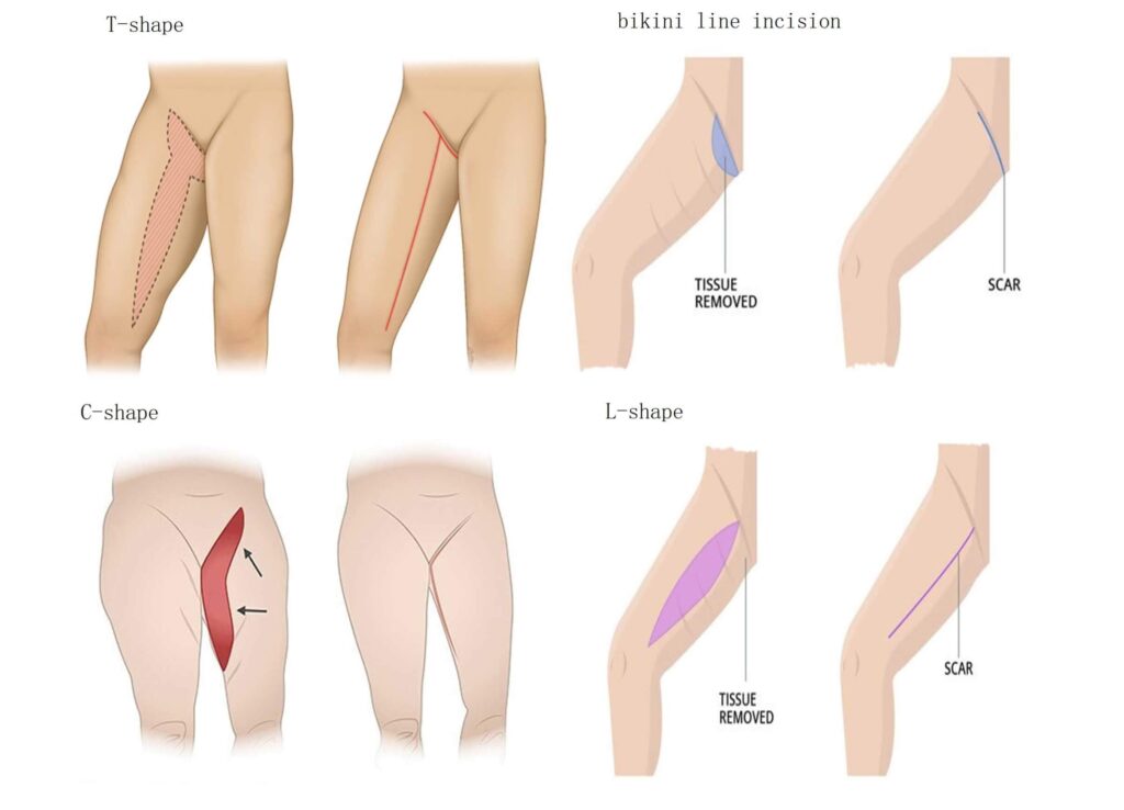 Another technique removes excess skin from the groin down to the knee using an incision along the inseam.